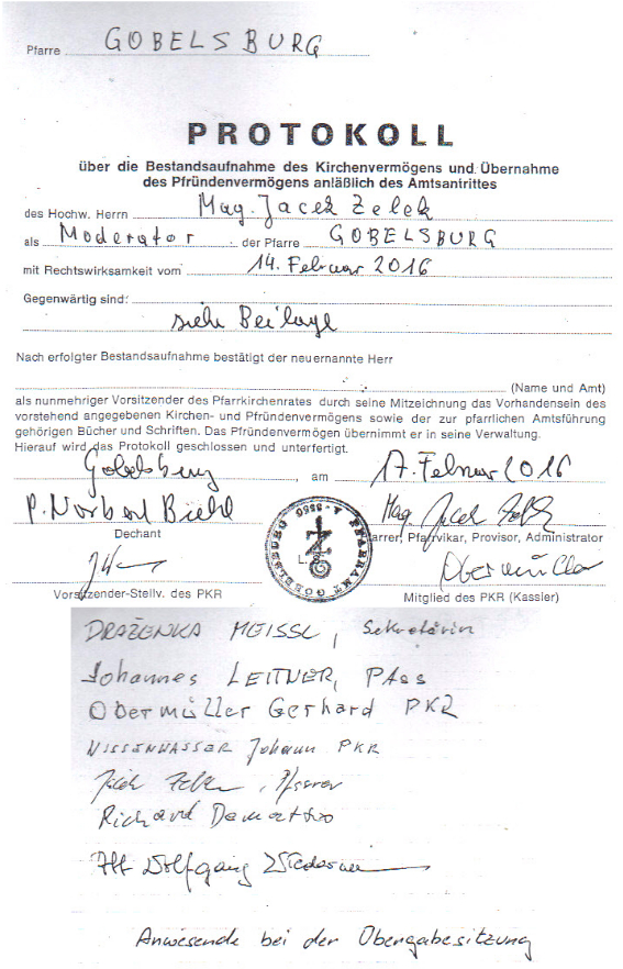 In einer Sitzung am 17.02.2016 wurde Mag. Jacek Zelek rückwirkend ab 14.02.2016 als Moderator der Pfarre eingesetzt, wie im Protokollausschnitt ersichtlich ist. Zeitgleich erfolgt die Einbindung der Pfarren Gobelsburg und Schiltern in die „Gemeinschaft Langenloiser Pfarren“.